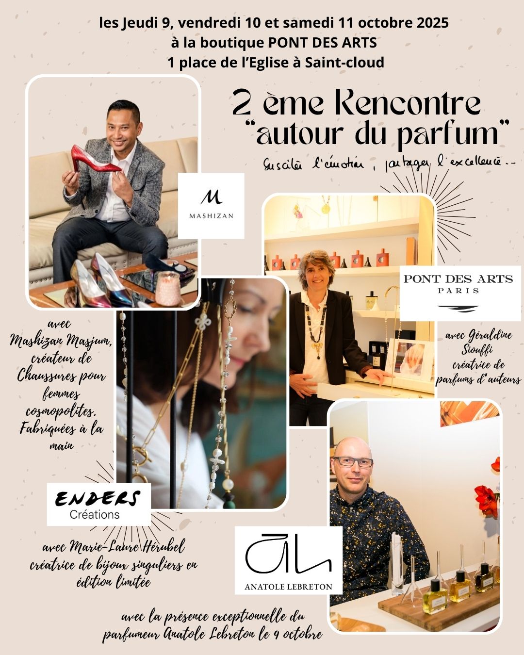 Retrouvez la 2ème édition des rencontres « autour du parfum » avec la créatrice de bijoux Marie-Laure Hérubel – Enders créations, pour découvrir sa nouvelle collection de bijoux modernes et insolites, avec aussi la présence de Mashizan Masjum – MAZHIZAN, créateur de chaussures pour femmes cosmopolites fabriquées à la main et, à mes cotés,  le 9 octobre la présence exceptionnelle du parfumeur ANATOLE LEBRETON qui vous présentera sa collection de parfums d’exception.